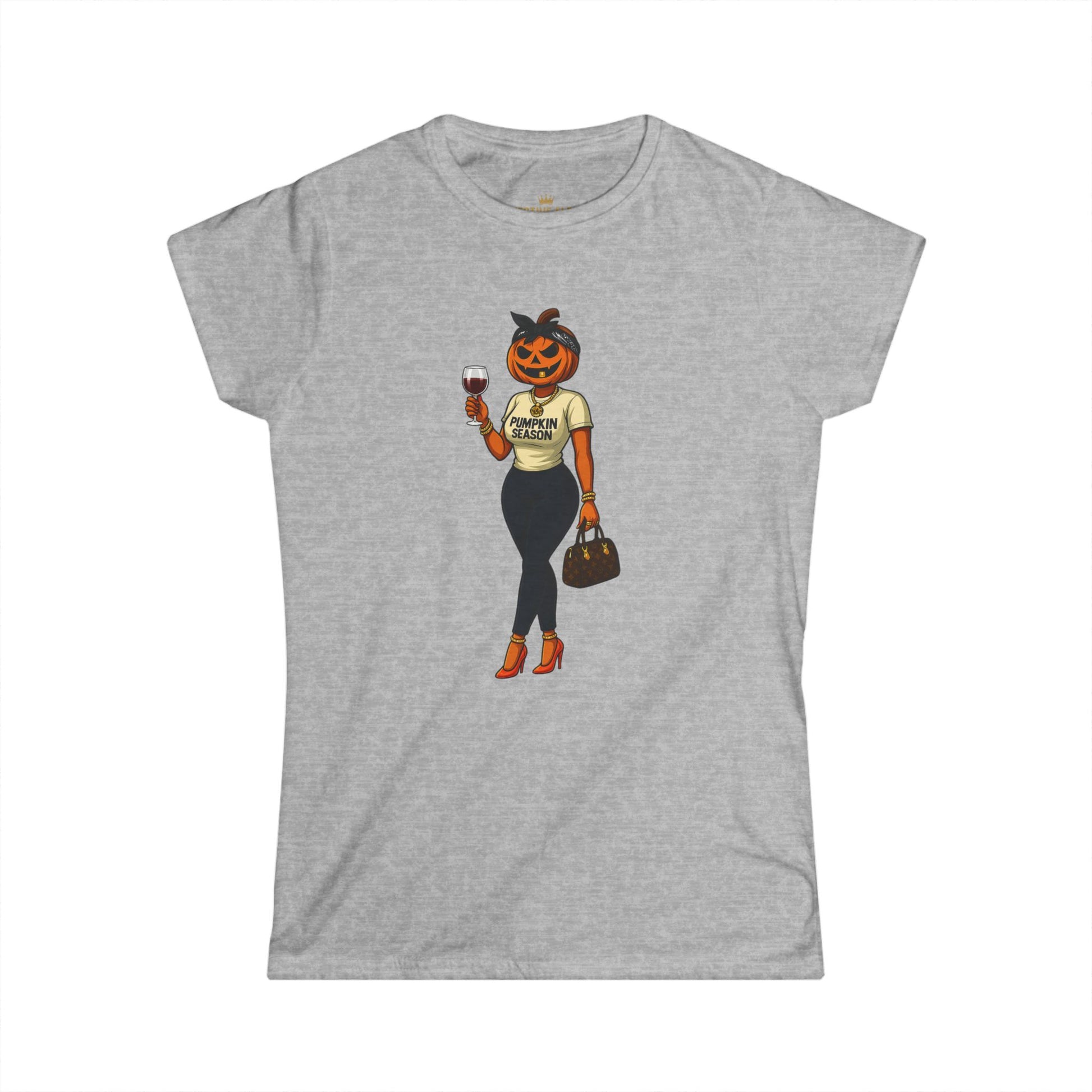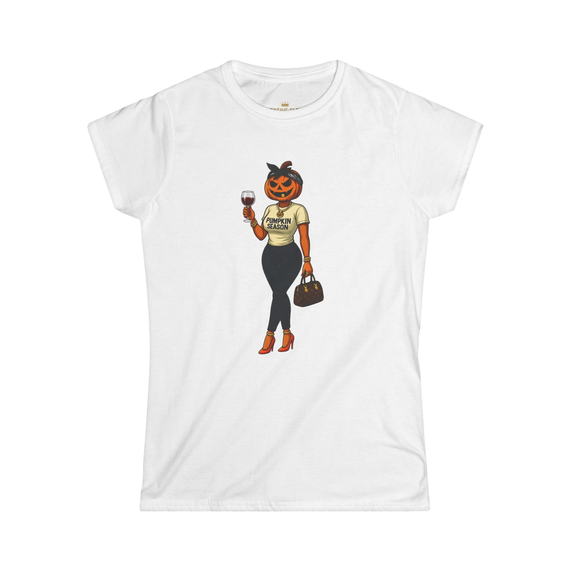 Elevate your fall wardrobe in this Miss Pumpkin Women's Fitted Tee. She’s bold, she’s classy, and she’s a little bit bad. With her gold jewelry, designer bag, and glass of wine, she brings luxury energy to the fall season. Whether you're out on the town or lounging at home with a glass of wine this piece was made for anyone who loves fall fashion with attitude.
